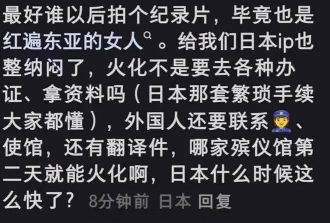 除了拒绝抽血化验,大S去世后迅速火化,同样引发网友广泛质疑。按照日本的殡葬流程和相关规定,火化并非一件简单的事情,尤其是对于大S这样在国外去世的外国人,手续更是繁琐复杂。