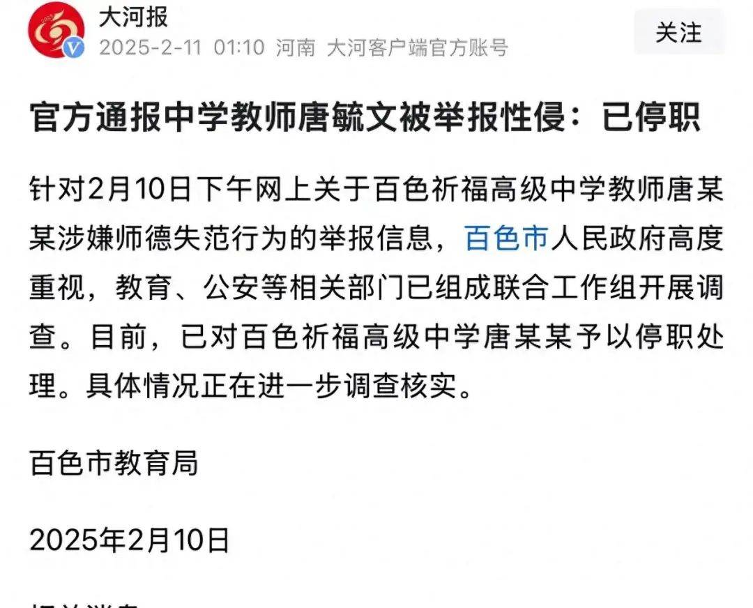 然而,一则百色教师唐毓文被举报性侵的消息,如一场迅猛的暴风雨,无情地冲击着人们对教育净土的美好憧憬,在社会各界掀起惊涛骇浪,公众的愤怒与质疑如汹涌的潮水,评论区更是被谴责与痛惜的声音淹没。