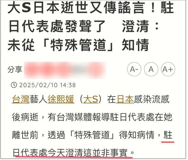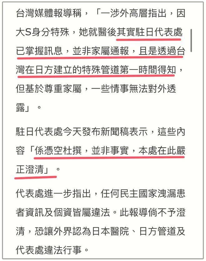 针对此前台媒报道的“驻日代表处通过特殊渠道,第一时间掌握大S病情讯息”,代表处也予以坚决否认,称这些内容是凭空杜撰,毫无事实依据。事实是大S离世后,家属向他们询问后续相关事项,他们才得知这一噩耗。