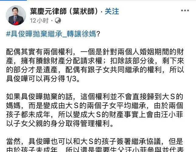大S的遗产处理问题,也成为网友关注焦点,引发了众多争议。据传言,大S早在去年就立下遗嘱,将全部财产留给母亲和两个孩子。