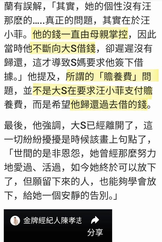 而汪小菲给大S的所谓“赡养费”其实只是个名目,大S的真实目的是希望他能归还昔日借的借款,并不是真的等他赡养。