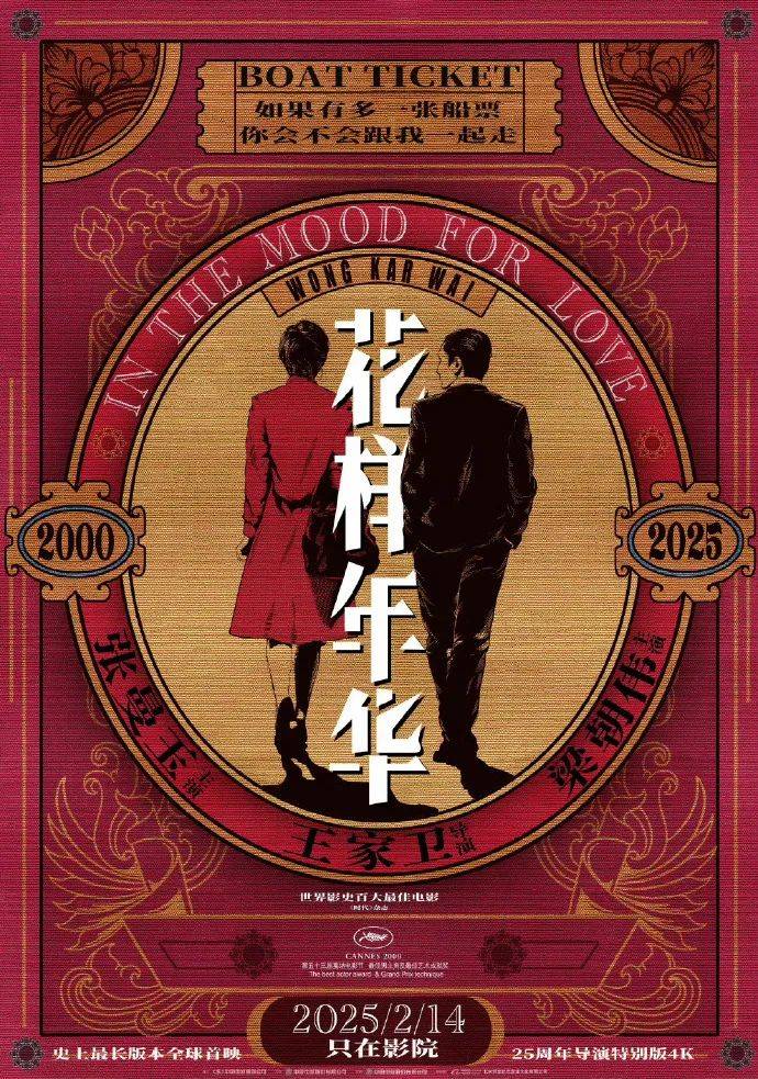 电影《花样年华》25周年导演特别版发布一张“花重开,胜如旧”版元宵节海报,海报还原了《花样年华》中的经典名场面,海报中央,是苏丽珍(张曼玉 饰)与周慕云(梁朝伟 饰)并肩同行的背影,但苏丽珍不再旗袍裹身,而是身着一身现代的风衣。