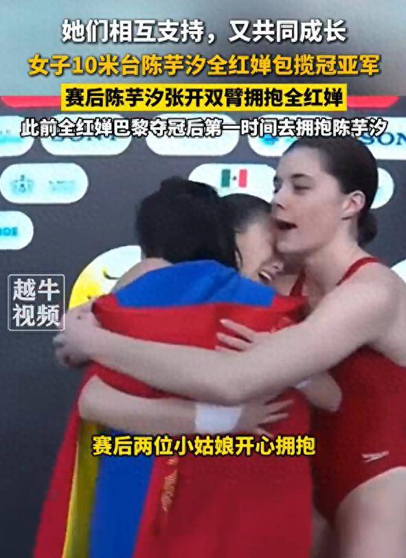 跳水世界杯墨西哥站女子10米台决赛中,陈芋汐以419.35分的高分击败全红婵夺得冠军,在领奖台上,陈芋汐张开双臂拥抱全红婵,而在之前的巴黎奥运会上,夺得金牌的全红婵跑着去拥抱陈芋汐,两人既是竞争对手,也是最好的朋友,而这一次全红婵终于敞开的笑了。