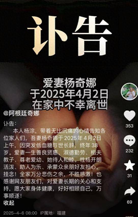 有数位网友更新动态,沉重悼念来自阿根廷的中国媳妇杨绮娜,4月6日,杨绮娜的老公杨淙对外发布讣告,确认了妻子不幸离世的消息,从讣告中可以得知,杨绮娜4月2日因突发低血糖在家中猝逝,将生命永远定格在38岁。