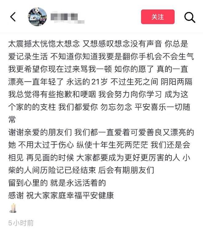 从妹妹的叙述中可以得知,小柴不但漂亮明媚,而且善良懂事,生前一直很受身边人欢迎,她的离去让太多人感到痛心疾首,而身为妹妹亦是如此,并且表示日后自己也会像姐姐一样成为家中的顶梁柱,由此可看,小柴生前无疑是一家人的精神寄托。