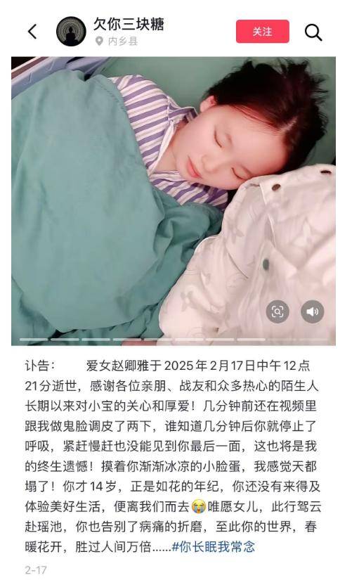 小雅爸爸此外还一并公开女儿离世之前的照片,照片中的小雅还是那样清秀可爱,正如爸爸在讣告中所说的那样,几分钟前小雅还和家人在视频里做鬼脸,孰不知几分钟之后便永远停止了呼吸,连爸爸的最后一面都没能见到,这也是小雅爸爸的终生遗憾。