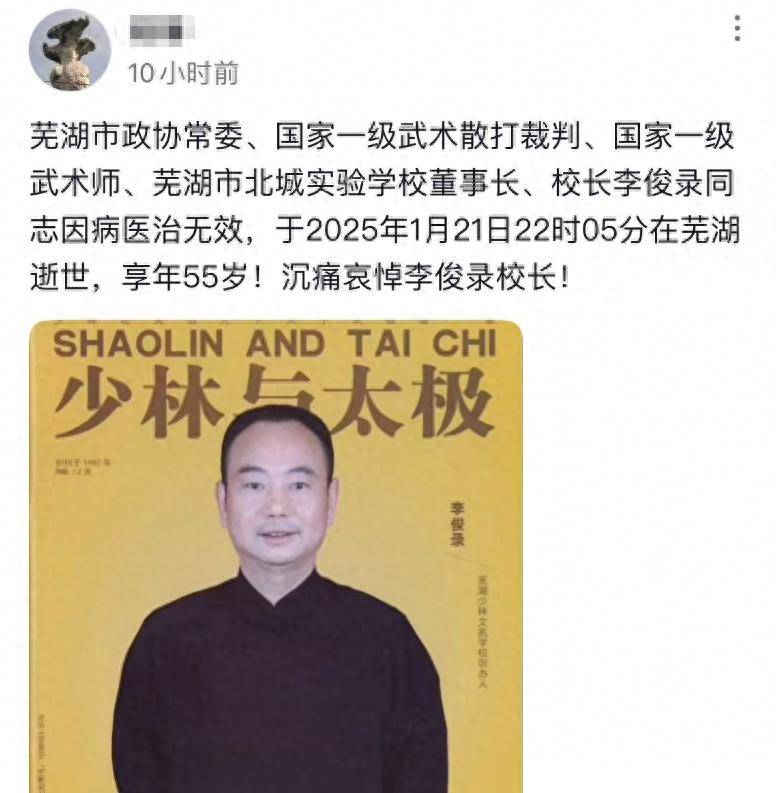 有网友发文告知,国家一级武术师李俊录在安徽芜湖不幸病逝,终年55岁。