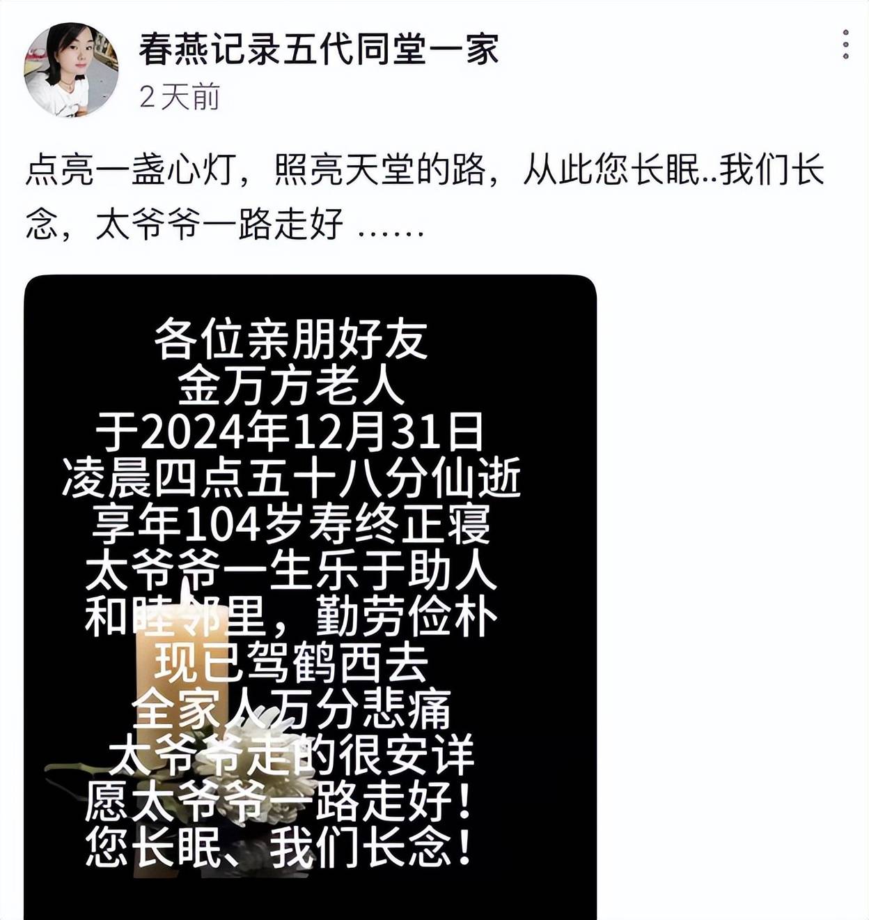 据悉,金万方的重孙媳妇名叫春燕,一直以来都用视频记录的方式分享自己家五代同堂的美满生活,在网络上也一直颇受欢迎,至今已经积累了近百万的粉丝。