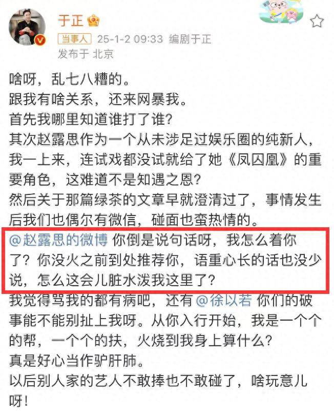 从不嫌事大的于正也搅和了进来,他还主动发动态介入舆论,喊话赵露思出来回应,说自己没怎么着她,为什么脏水泼到他那里,还说自己对赵露思有知遇之恩,言里言外都是各种内涵。