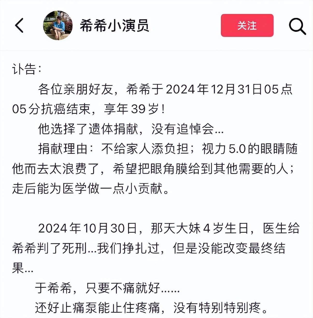 家人也公开了希希捐献理由,不想给家人添负担,视力5.0的眼睛随他而去太浪费了,希望把眼角膜给到其他需要的人,走后能为医学做一点小贡献。