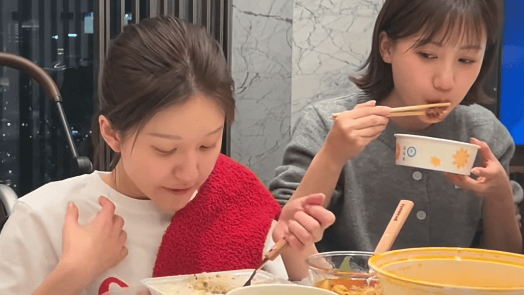 连手指都不听使唤,吃饭的时候只能用勺子挖着吃,动作笨拙,吞咽也变得困难,和好友的动作成鲜明对比。